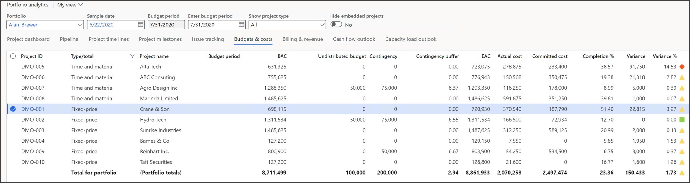 Example of portfolio project costing reporting in PlanAutomate.