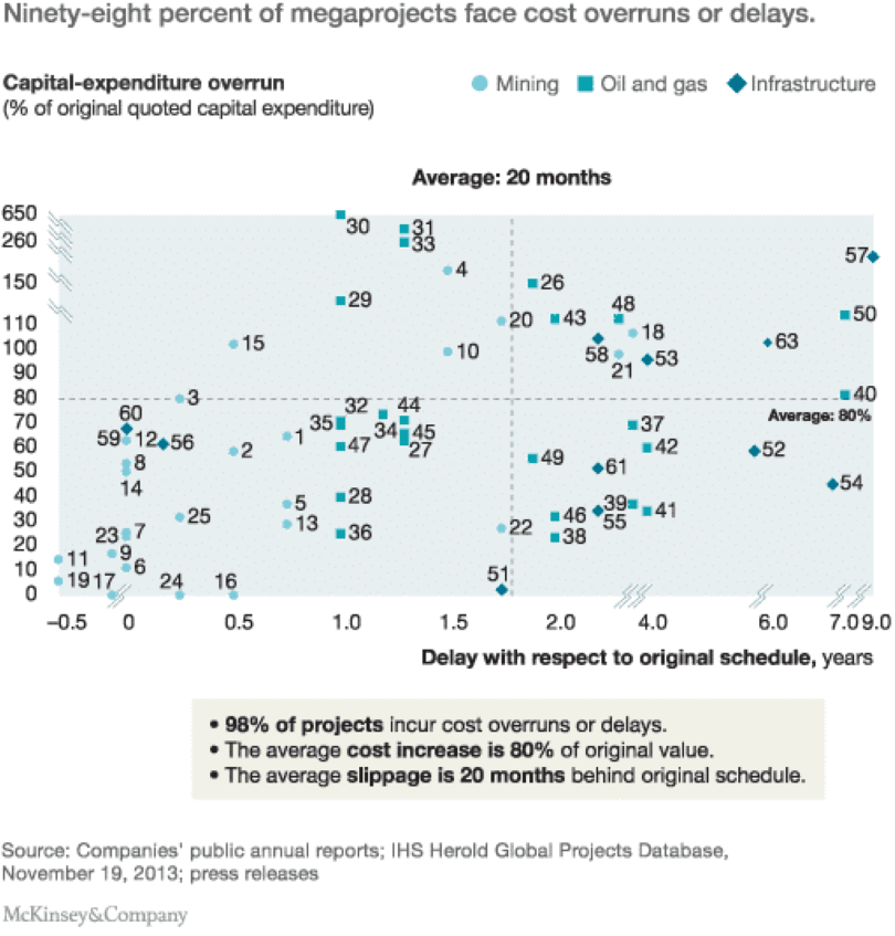 Second, the construction industry does horribly when it comes to completing projects on time and on budget, pointing to research that estimates that 98 percent of megaprojects suffer cost overruns of more than 30 percent; 77 percent are at least 40 percent late.
