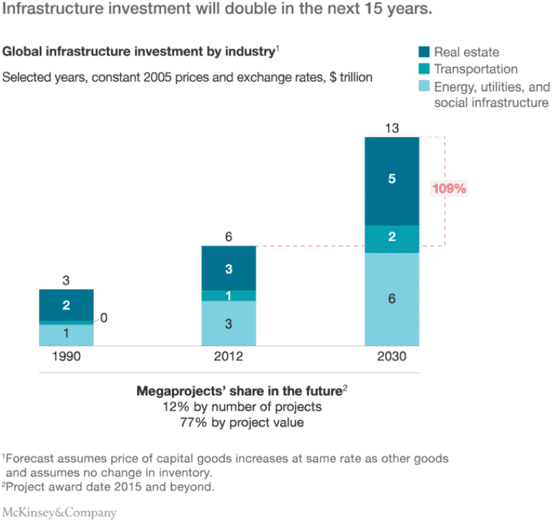 To make the argument that there is a systemic problem that can be addressed, McKinsey cites 3 relevant pieces of data. First, the fact that infrastructure investment will double in the next 15 years, which means managing these projects will be an even bigger struggle. See the figure below.